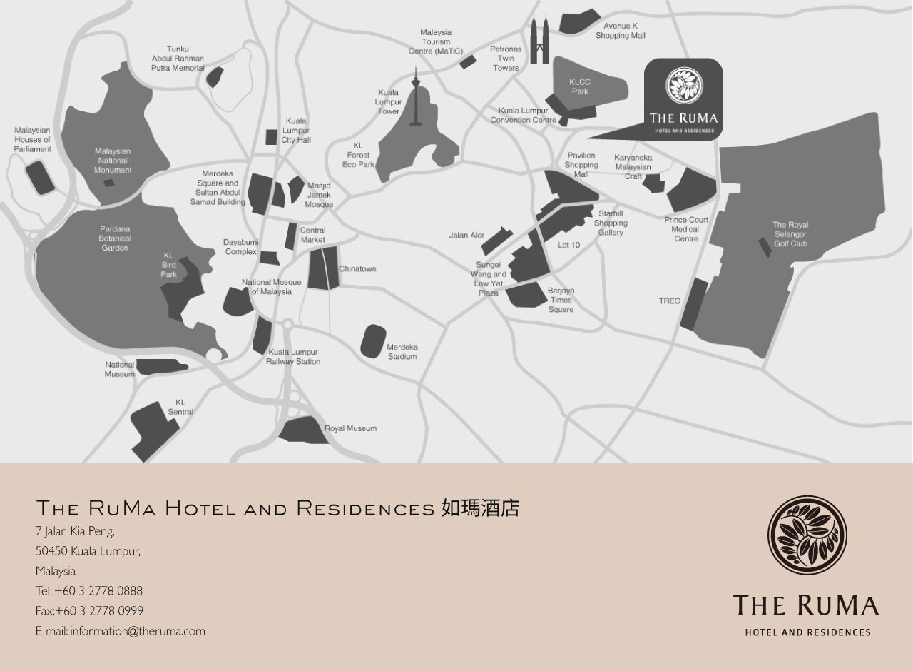 从吉隆坡国际机场搭乘机场快铁前往吉隆坡中央车站,即可到达如玛酒店及服务式公寓,全程大约 45 分钟。